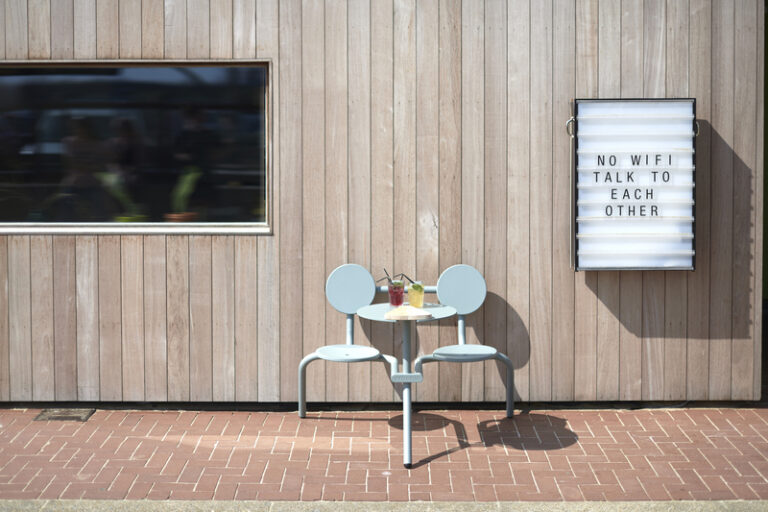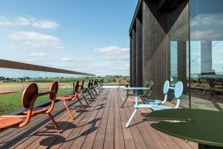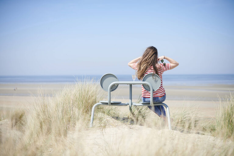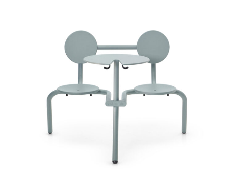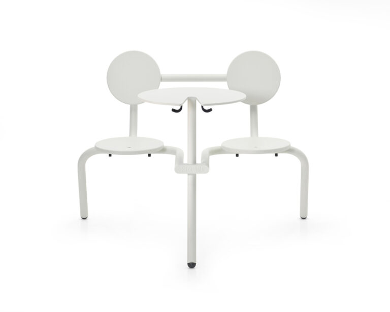 Bistroo is an innovation in the contract market: it’s a practical, weatherproof two-seater dining set. The clever three-legged design makes it perfectly stable on any surface, and, what is more, it is easier to stack and lock away than individual tables and chairs. Structured, powder coated metals are combined with clever features and accessories. Bistroo is ideally suited for small spaces and feels right at home against the backdrop of a cozy, compact restaurant or on a small city balcony.