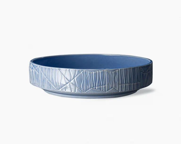 Bowl made by slip casting in white clay. Shiny light blue crackle glaze.
