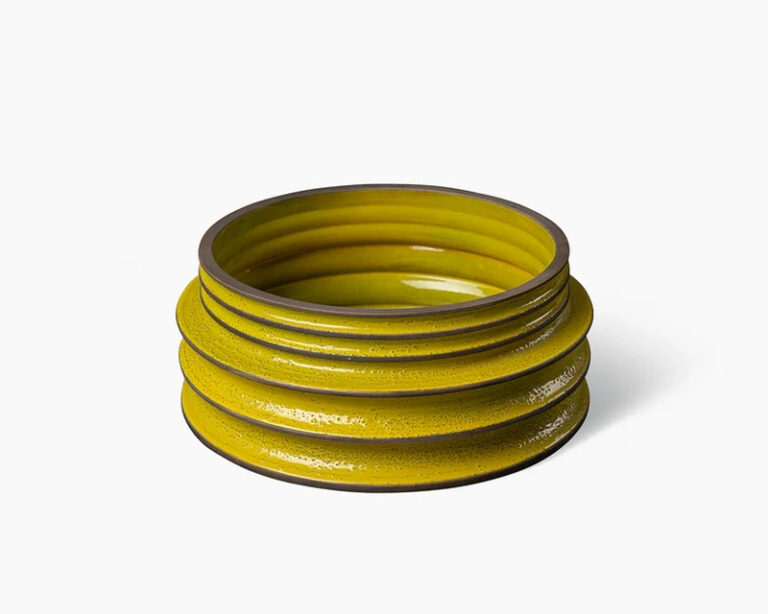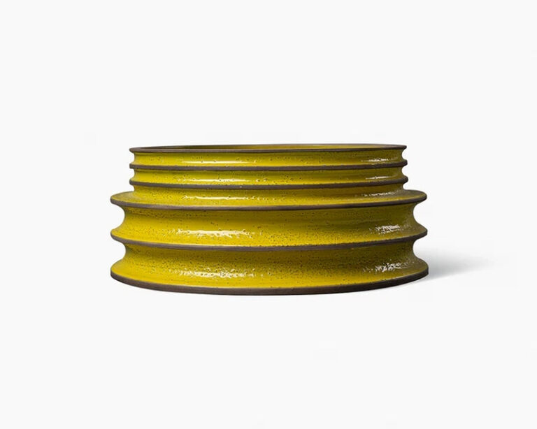 Centrepiece, made by using the casting technique in white clay. Yellow crystalline over brown engobe. The engobe is a clay-based color that is spread over the still unfired ceramic surface. The rough surface results from the presence of sand grains within the engobe.
