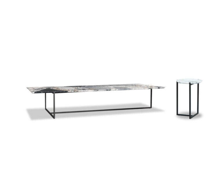 The Icaro Stone collection of marble and stone coffee tables marks out spaces with support elements characterised by timeless elegance and style. Made of natural stones that retain their unique markings, these coffee tables combine a top in different varieties of marble and granite with a solid matt black painted metal base. Baxter’s minimalist design blends refinement and functionality, creating a furnishing accessory that is ideal for embellishing any room, from the living room to the office, with a distinctive aesthetic that is sure to make an impact.