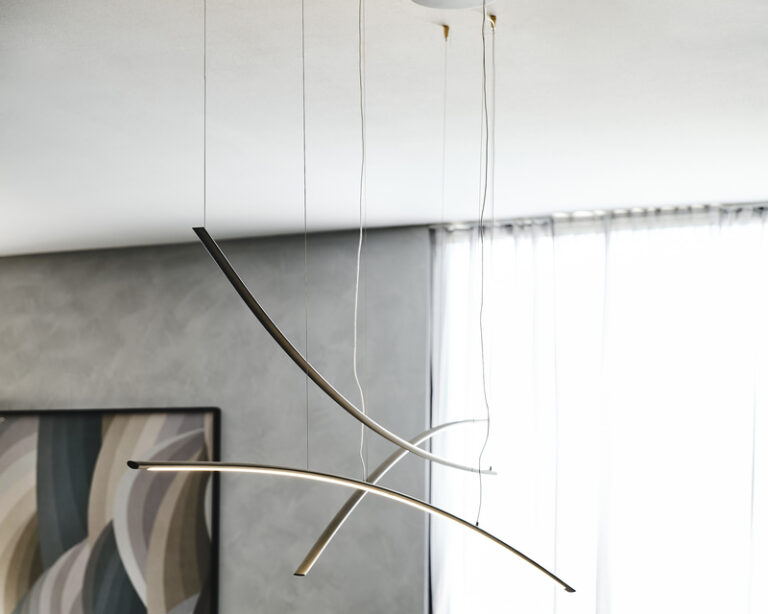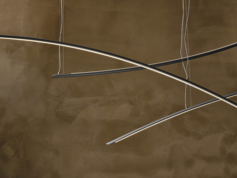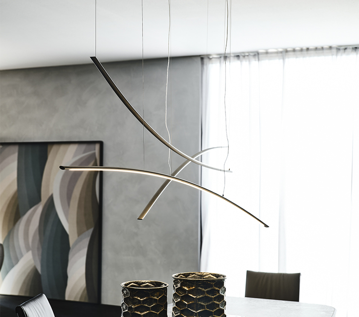 It is produced in 2 versions: Katana and Katana Magnum.The second is equally long but larger, as the name suggests. Both variants are divided into UP and DOWN versions, depending on the direction in which the arc is facing. What makes this modern lamp highly customisable is the opportunity to create arrangements by combining all available versions into one striking and ultra-contemporary chandelier.