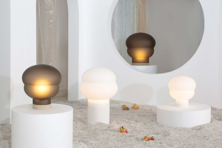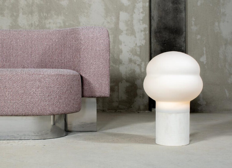 NO-MADE, the Dutch design team of Cleo Maxime and Linde Freya enjoy combining materials with cultural dialogue. Kumo, their series of table and floor lighting is modelled in the style of arbitrary cloudscapes, and the surface resembles Japanese paper lanterns. Their glowing silhouettes, resulting from soft, golden colours on frosted glass, rest on solid limestone.