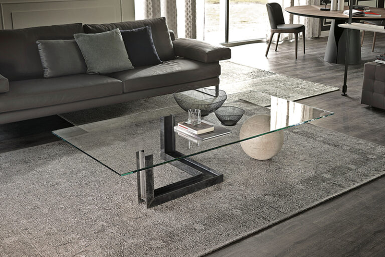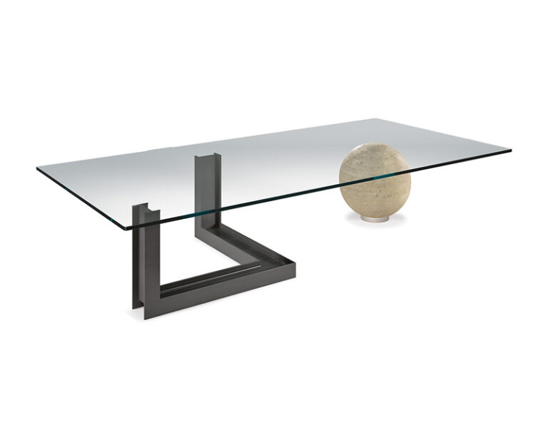 Levante is a design glass coffee table created by Giorgio Cattelan, with an incisive sculptured character that completes a modern design living room with style and elegance. The glass top lets you appreciate the base, made up of two contrasting sculptural elements, in its entirety. The first is reminiscent of a steel beam, bent at right angles, whose rough finish enhances its industrial style. The second is a sphere in natural travertine whose porosity contrasts with the hardness of the glass and steel next to which it is placed. This modern glass coffee table for the living room is an item with an original yet refined style, thanks to the materials worked with skill.