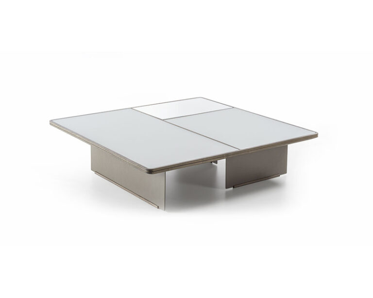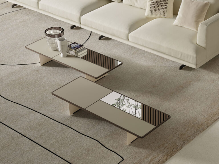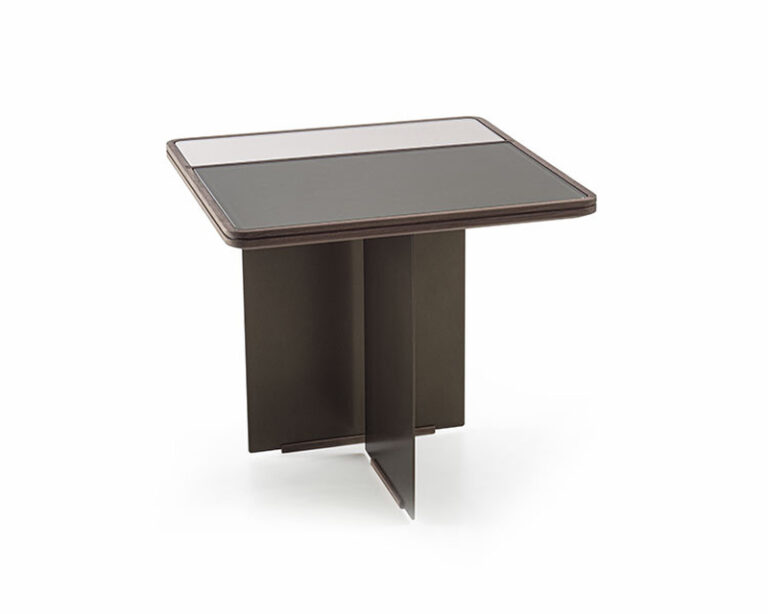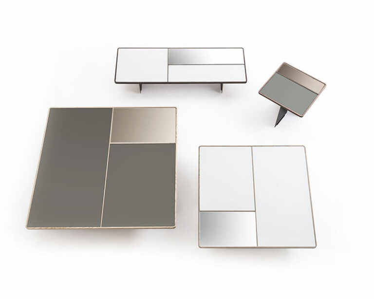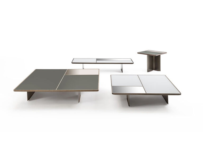 The small tables Mies, essential in the shapes, have a structure and top in solid wood, available different finishes, worked with the pantograph which frames the top by creating three inserts which are filled in with back-lacquered glass and mirror in two variants. Two different words, where to the different wooden finishes, a specific match of glass and mirror, is made, either light or dark. The asymmetrical legs in painted metal are placed according to the size of the small tables’ tops, thus creating a refined and variable visual play of colours and materials, tone-on-tone, according to the point of view of the observer.
