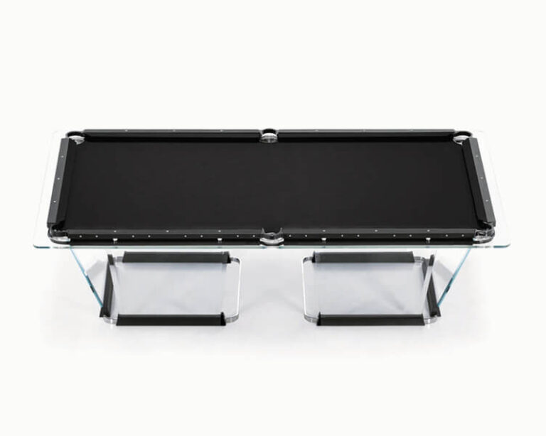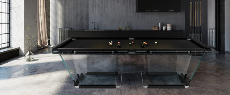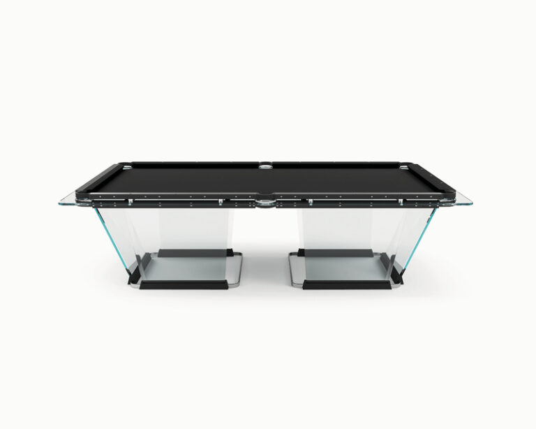 The Teckell® T1.1 Black pool table with black trim lures in both design aficionados and top players. The light dances across its handcrafted glass surfaces and glimmers when it strikes the black aluminum rails. The tempered glass playing field is at least 9/16” thick. A precise leveling system utilizing 12 screws is hidden inside the table’s black, solid oak base.