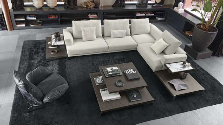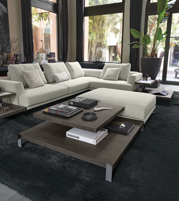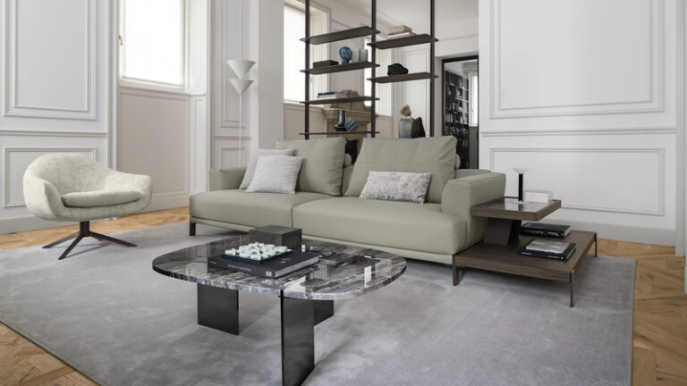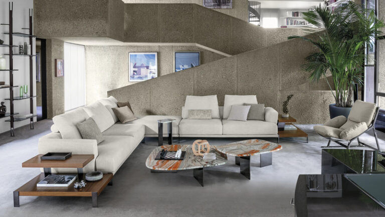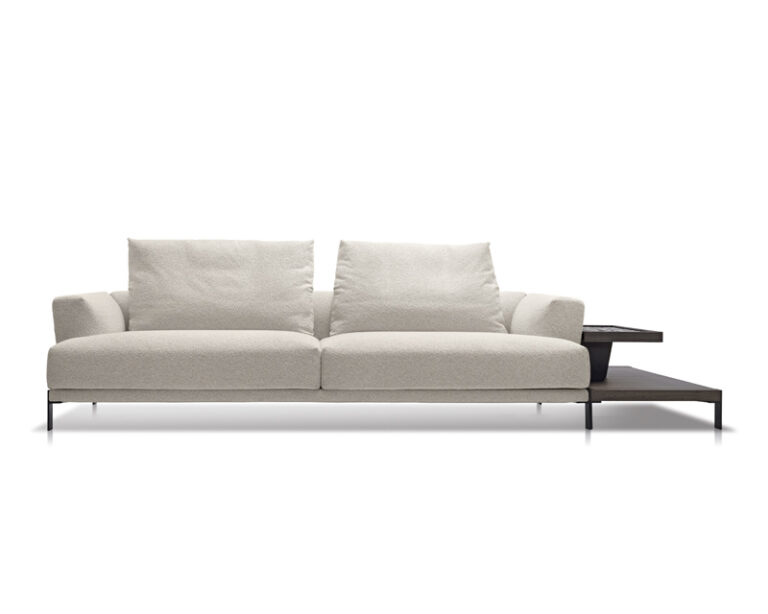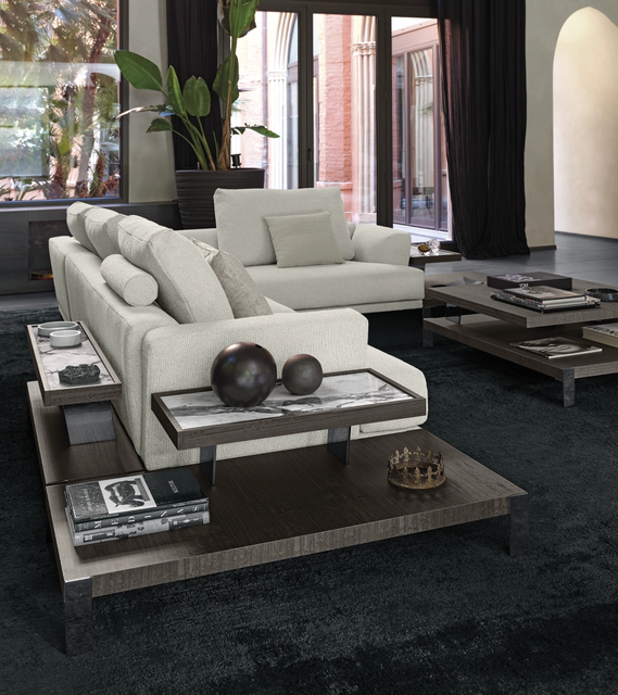 With its tall cushions, angled armrests, and deep seating position, That’s Life evokes a high-modern jazz lounge where one might easily trade glances with a member of the Mad Men ensemble. Autonomous platforms, both soft and rigid, come together in compositions that can be extended in virtually any direction to meet the various needs of domestic arrangement. The artisanally crafted components combine different types of wood with marble in imaginative juxtapositions. Capable of being paired with the upholstered elements in a variety of ways, they inspire an architectural free play that only strengthens the effect of articulated linearity. The gentle volumes of the armrests and backrests widen slightly toward the outer edges, as if beckoning in invitation.