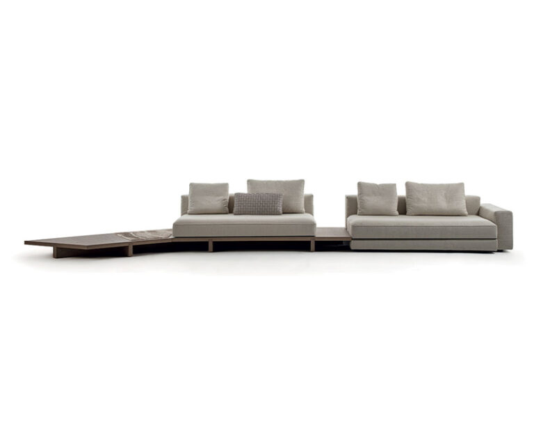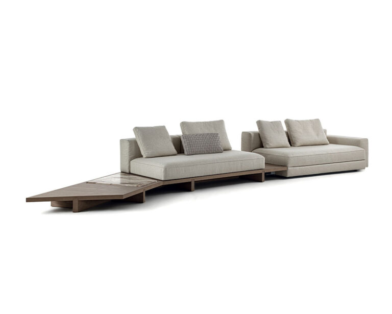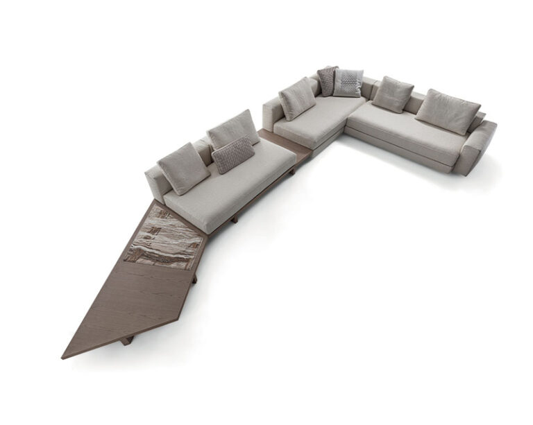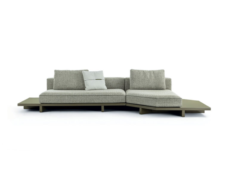 Ferruccio Laviani consolidates his collaboration with Frigerio by enlarging the View modern modular sofa collection with new modular elements and brand-new accessories for the living area. A perfect synthesis of the designer’s creative flair and the company’s decades of know-how in the upholstered furniture sector, View is modular sofa made of different elements that can be combined with ease: the sofa version with platform base, in wood and either glossy lacquered or upholstered on floor, they dialogue with each other and with a large number of elements, some with a classic taste, others with a more original design. For the wooden platform, two new glossy lacquered colours are added to the collection by adding to personalized accessories such as padded volumes, integrated bookcase elements, side and front small tables.